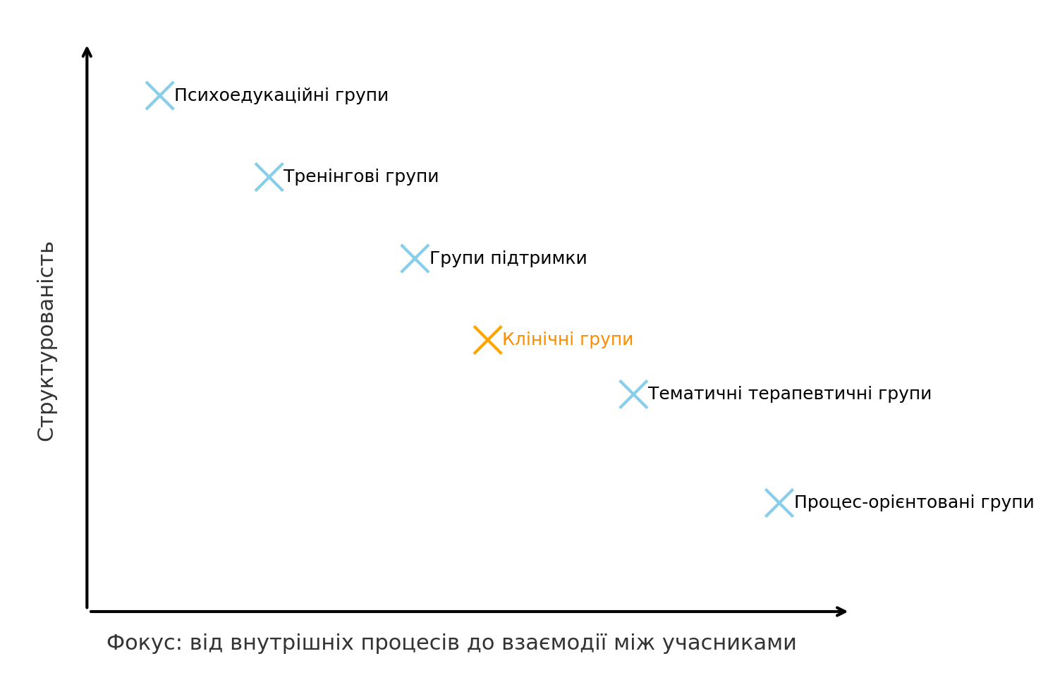 Перша вісь — структурованість. Вона показує, наскільки груповий формат має чітку рамку (висока структурованість) чи, навпаки, більше спонтанності (низька структурованість).